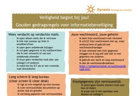 Vandaag wijzen we je nog een keer op onze Gouden gedragsregels voor informatiebeveiliging. Je vindt ze hier. Print ze uit, hang ze op je prikbord, zorg dat je ze kent, en dat je ernaar handelt. Zodat we veilig kunnen blijven werken.